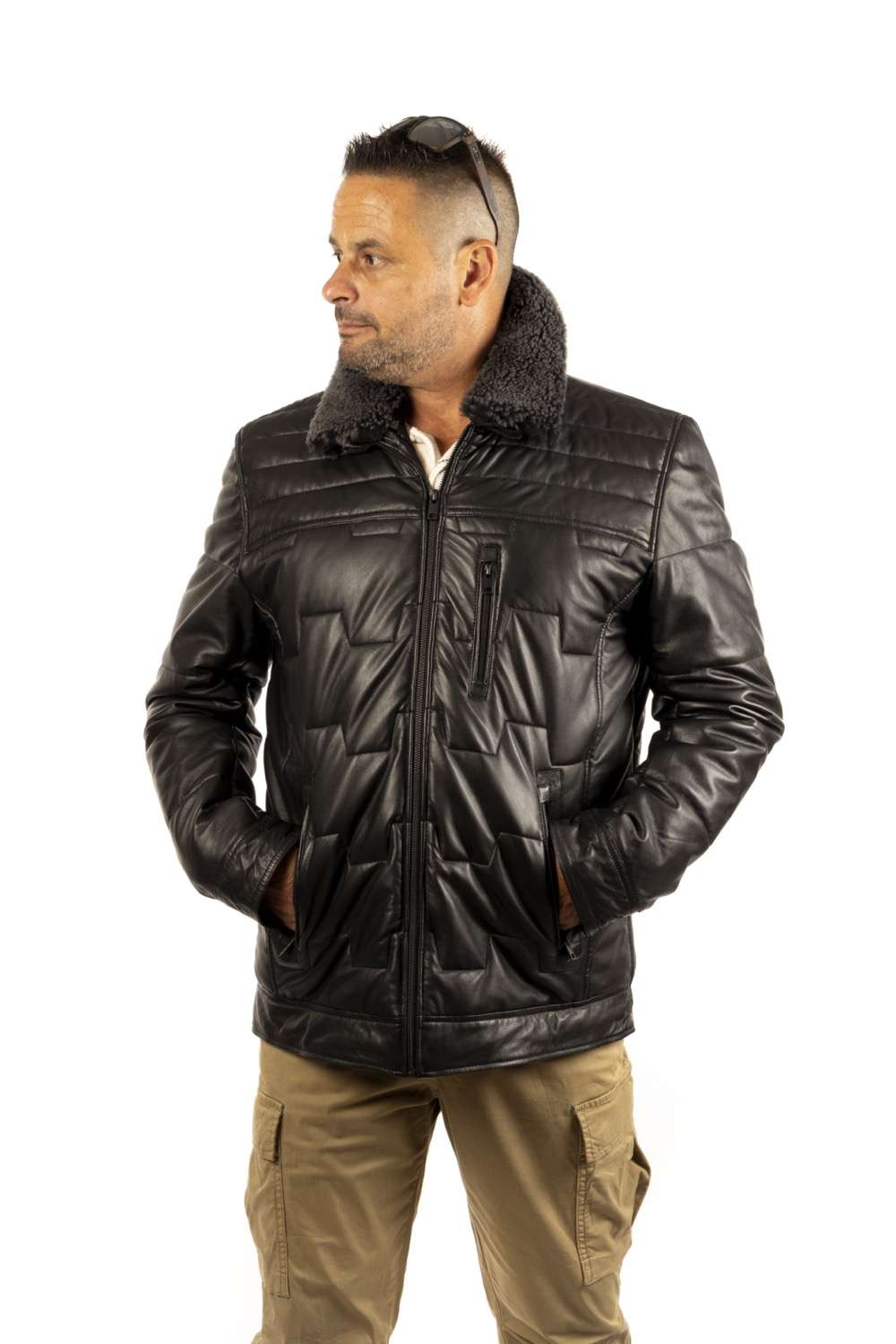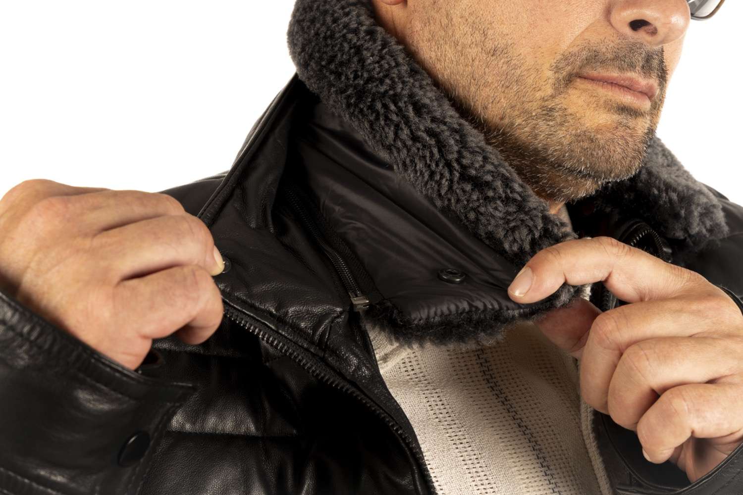 Chaqueta acolchada de piel ovina, cálida y sofisticada, con cuello de pelo desmontable y bolsillos interiores.