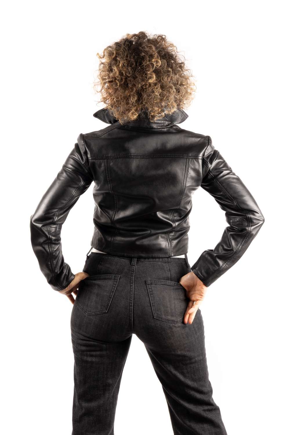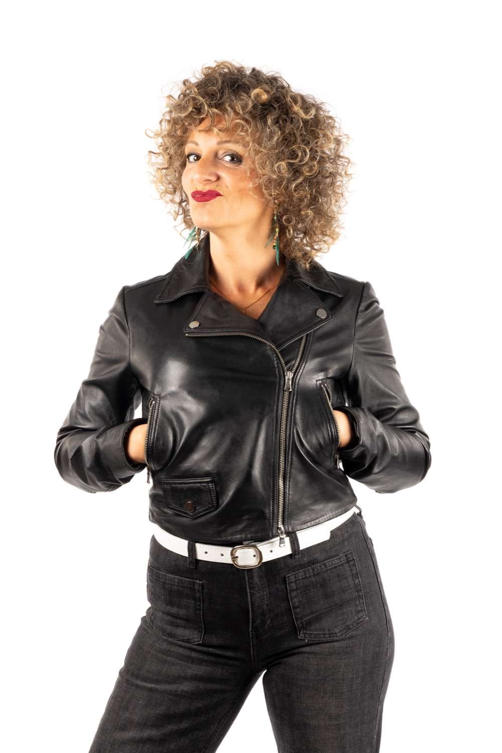 Chaqueta cruzada corta, atrevida y con un marcado espíritu rock. Piel ovina y actitud al 100%.